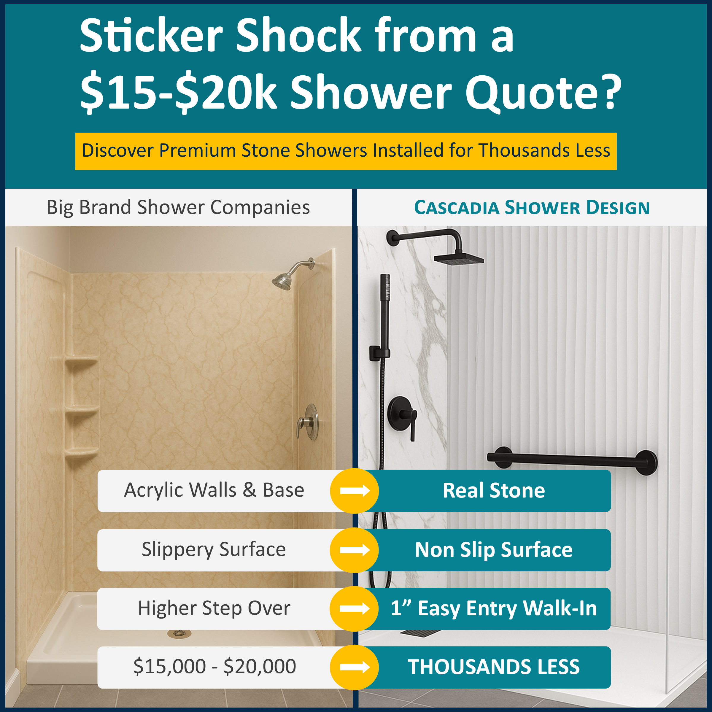 At Cascadia Shower Design, we transform outdated tubs and worn-out showers into stunning, easy-entry stone shower spaces. Whether replacing an old shower or removing a tub entirely, our expert installers complete most projects in just 1–2 days using premium stone materials — never flimsy plastic.