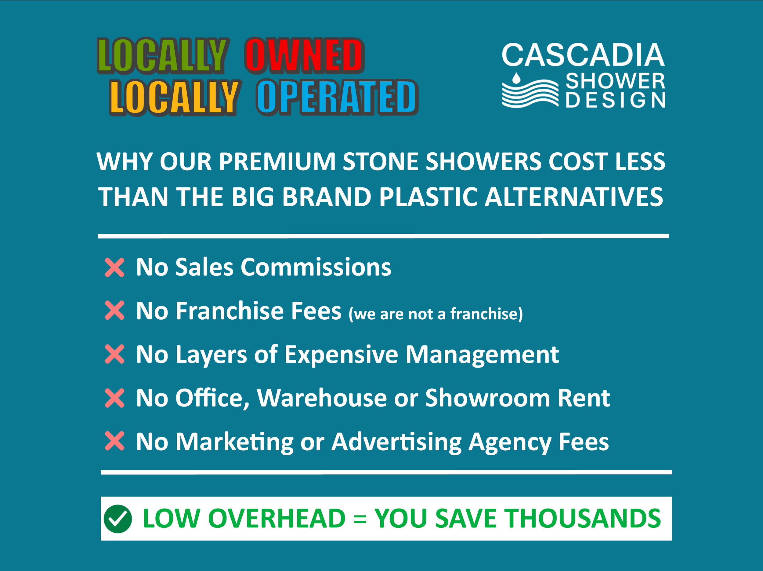 Cascadia Shower Design is a locally owned small business, not a national franchise. We proudly serve communities across the Puget Sound — including Bainbridge, Vashon, Whidbey, Bremerton, Gig Harbor, Sequim, and nearby areas — with a personal, no-pressure approach.